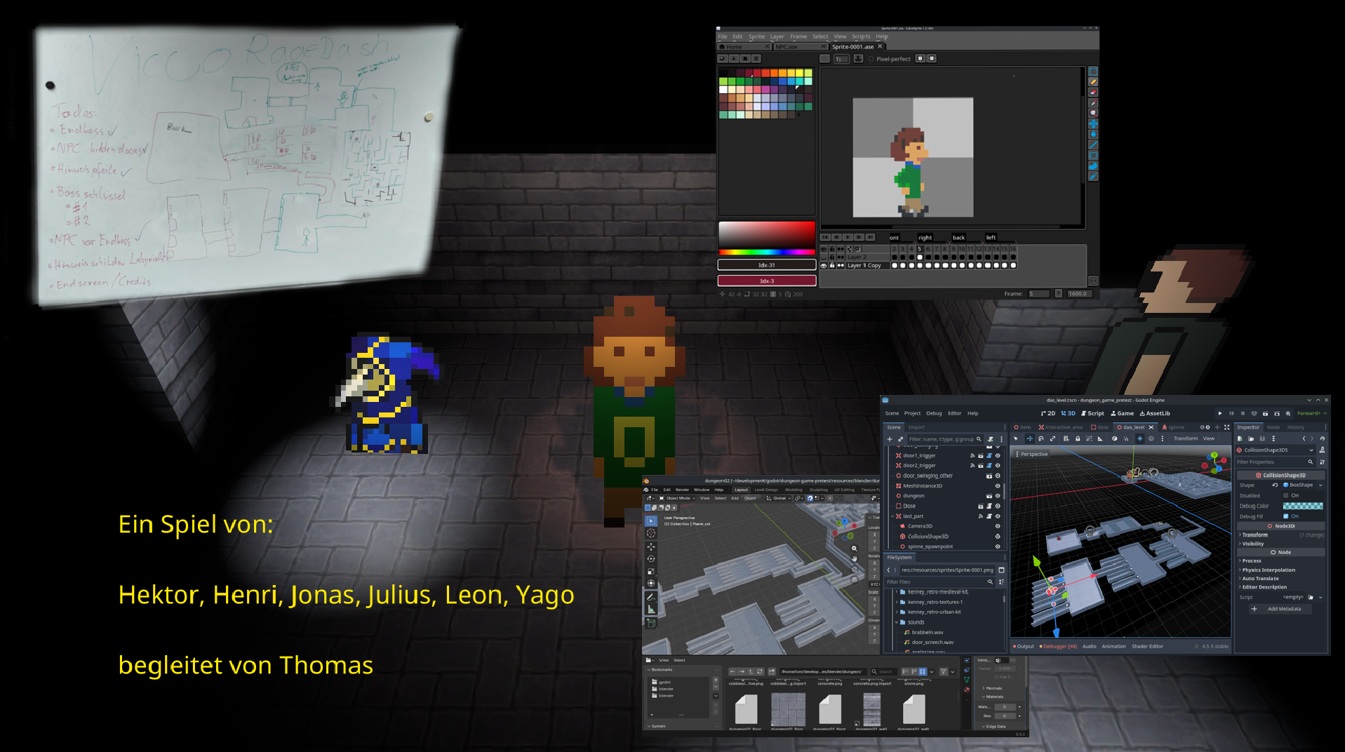 Der Inhalte wurden von den Teilnehmenden erdacht und vieles von ihnen zum Spiel erstellt. Alles wurde mit freier Software erstellt und aus freien Quellen bezogen.